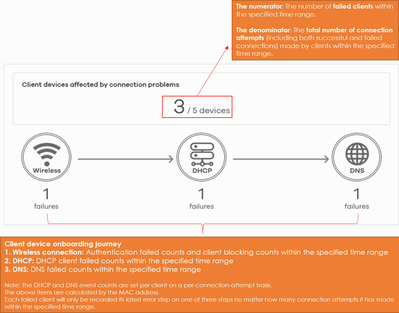The ‘Client devices affected by connection problems’ section will record the latest error step encountered by the client device in one of the three steps (Wireless DHCP DNS) during the wireless client onboarding journey.