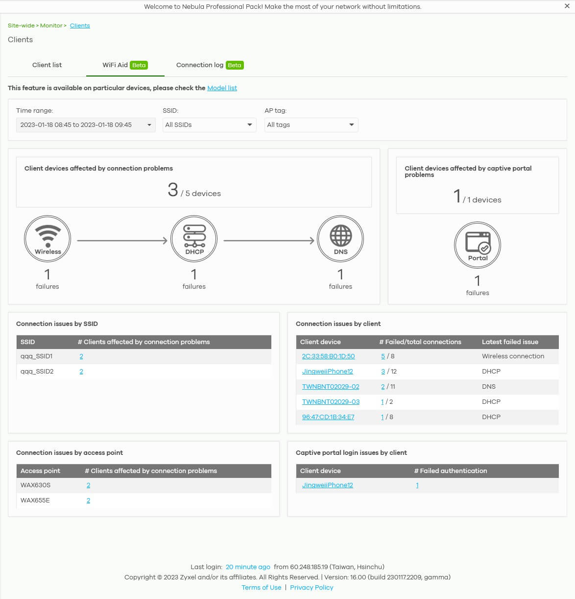 WiFi Aid (offered in Nebula Pro Pack) to provide users an intuitive dashboard and comprehensive data of WiFi client’s connection issues for automating network management and troubleshooting to deliver the best experience to WiFi users and network admins.