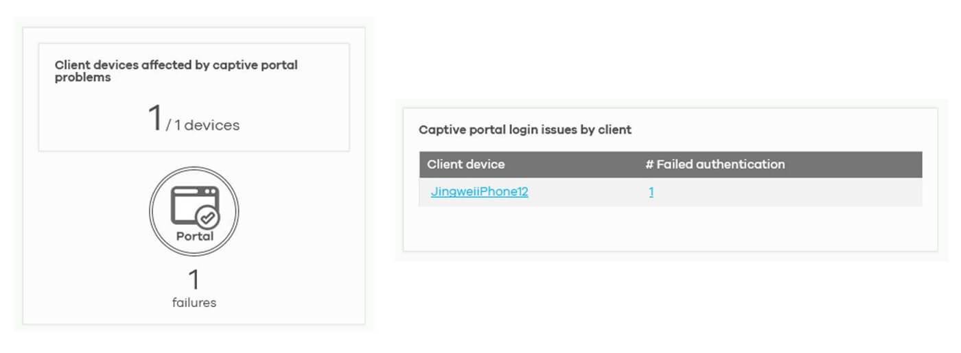 Image 1: The WiFi Aid dashboard gives an overview to summarize the issues of wireless client onboarding journey from accessing, authentication, DHCP to DNS query.