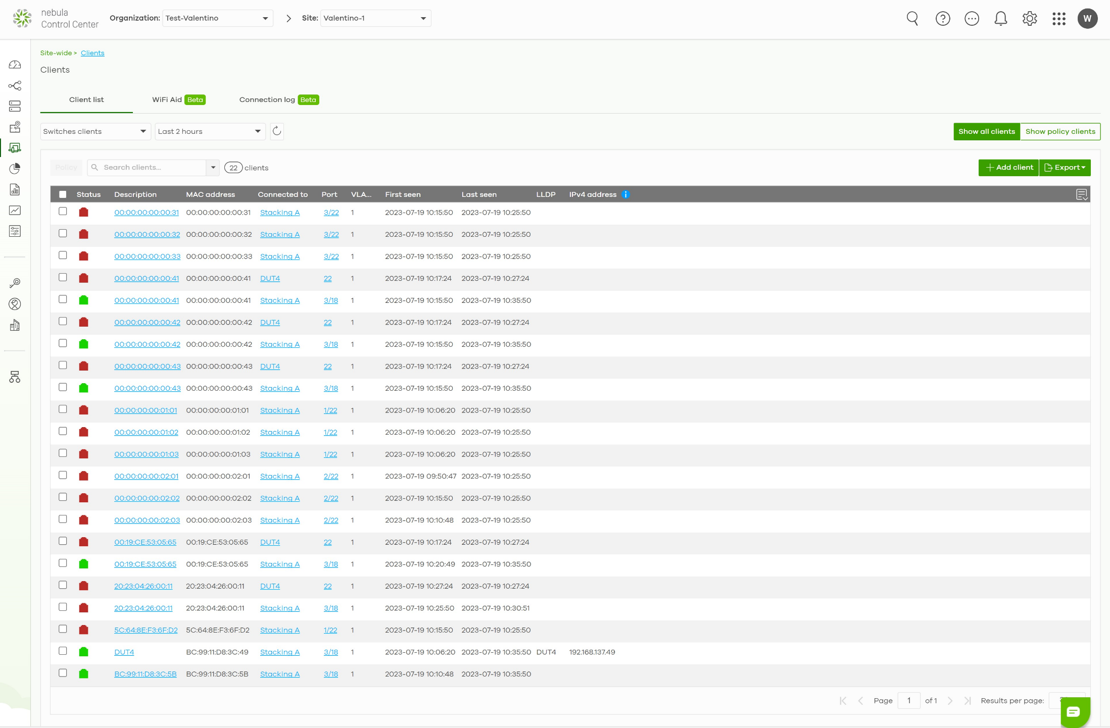 On the Switch clients page, you can track all the clients connecting to the Stacking and Non-Stacking switches in a single view.