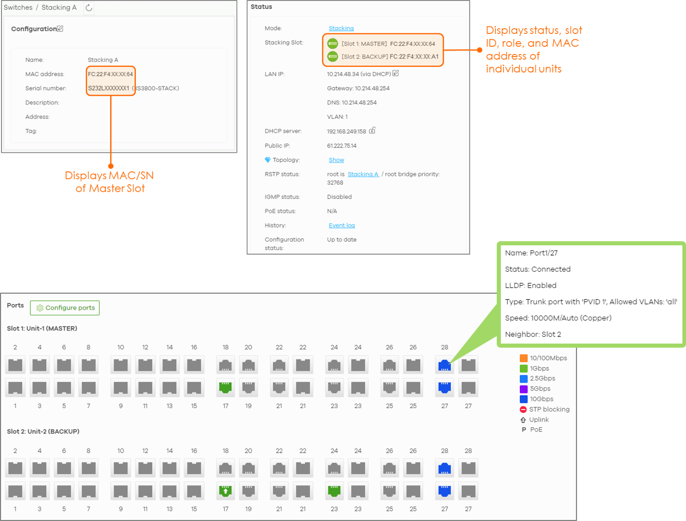 The stack detail page displays the in-depth information about the switch stack and shows the port status of each slot in the switch stack.