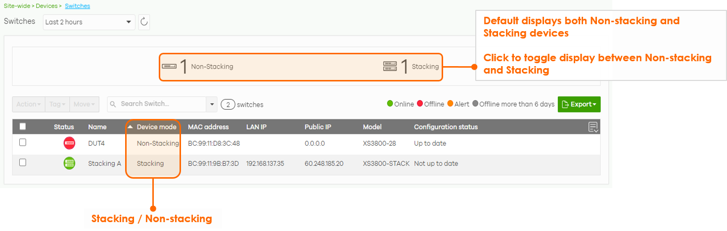 Combing the Non-Stacking and Stacking switches together, you can see the status and information of all the switches within the site at a glance, making it easy to monitor and troubleshoot.