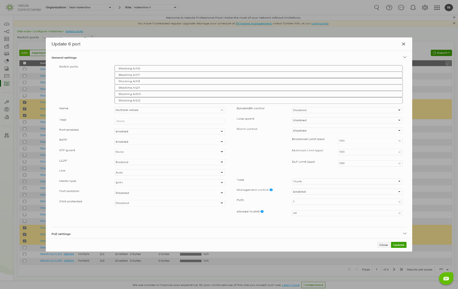 The switch ports page displays all the switch ports on the list, including Stacking and Non-Stacking switches. As shown below, the same configurations can be pushed to the selected switch ports in a one-time setting altogether.