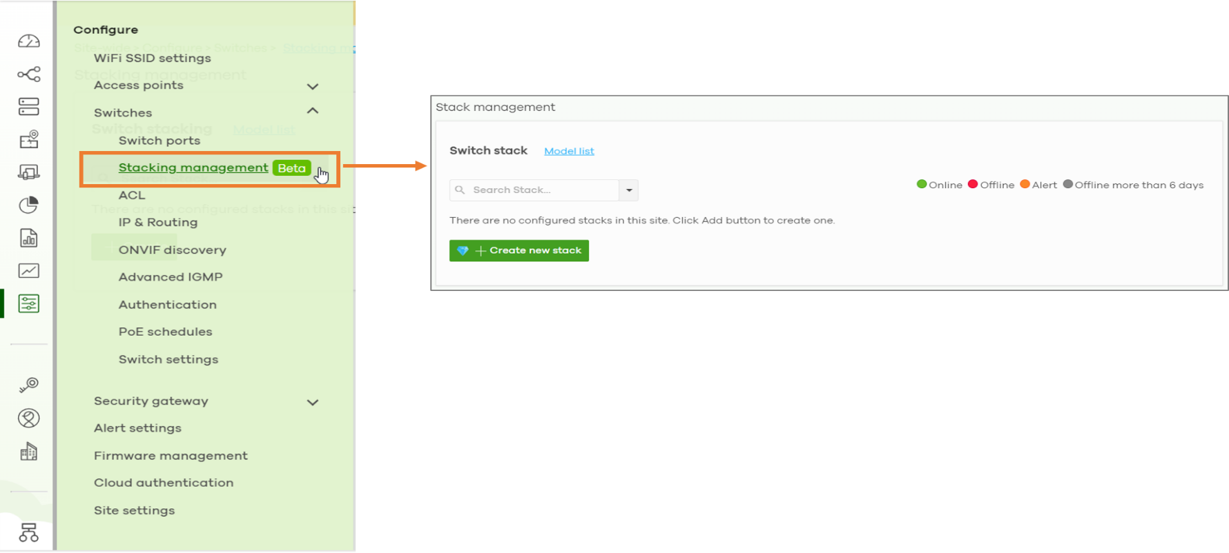 The wizard can be accessed through the menu by navigating to Configure > Switches > Stacking management > Create new stack