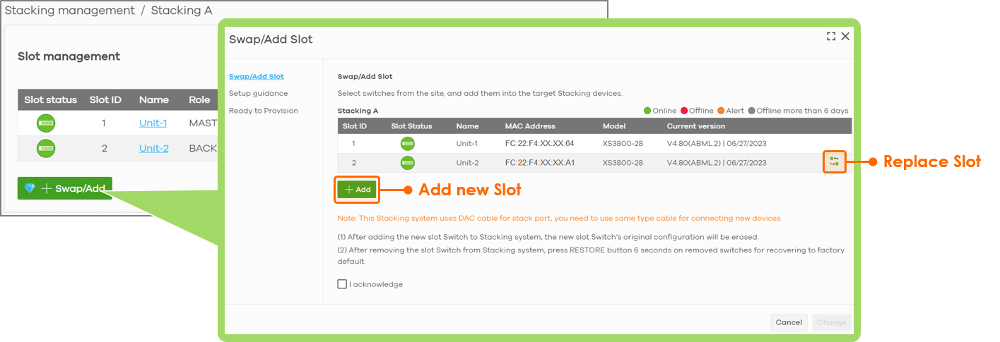 To modify the slots, go to Configure > Switches > Stacking management > Select the Stack you want to modify, and the stack units in the stack will be listed on the Slot management page.