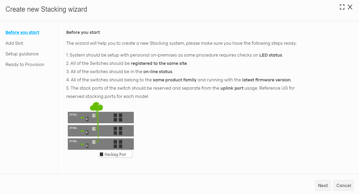 The wizard will guide you through step-by-step procedures to create a new stack, as follows. With the help of the wizard, users can easily convert the Cloud-managed switch units into a switch stack. Nebula allows a maximum of 10 stacks in a site.