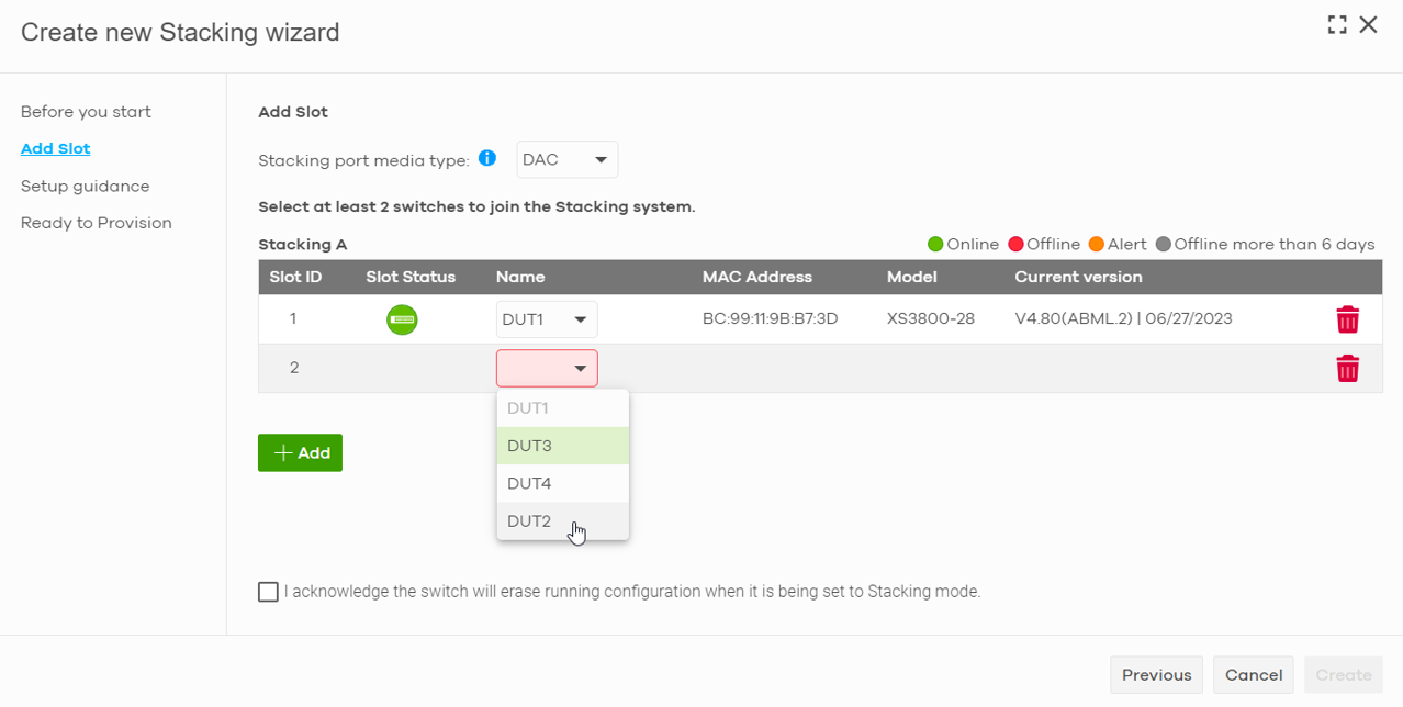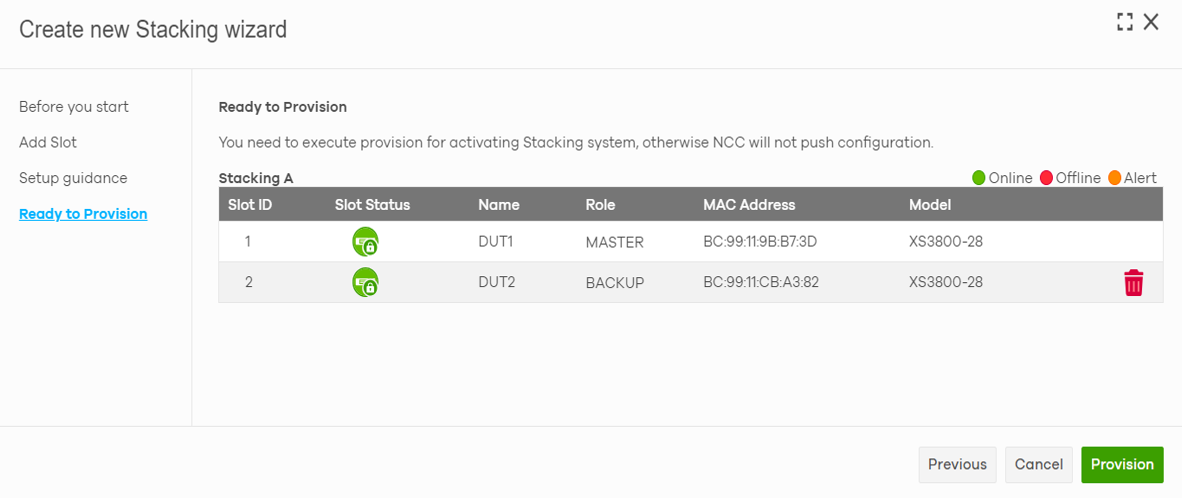 Step 4: Check the slot status and execute provision to activate the Stacking system.