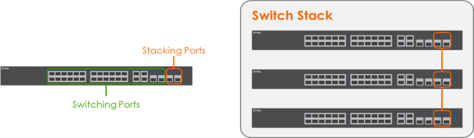 Switch Stacking* is an innovative technology that turns multiple physical switch units into a single virtual switch unit. This is achieved by utilizing dedicated switch ports to integrate additional switch units into the switch stack, as shown below.