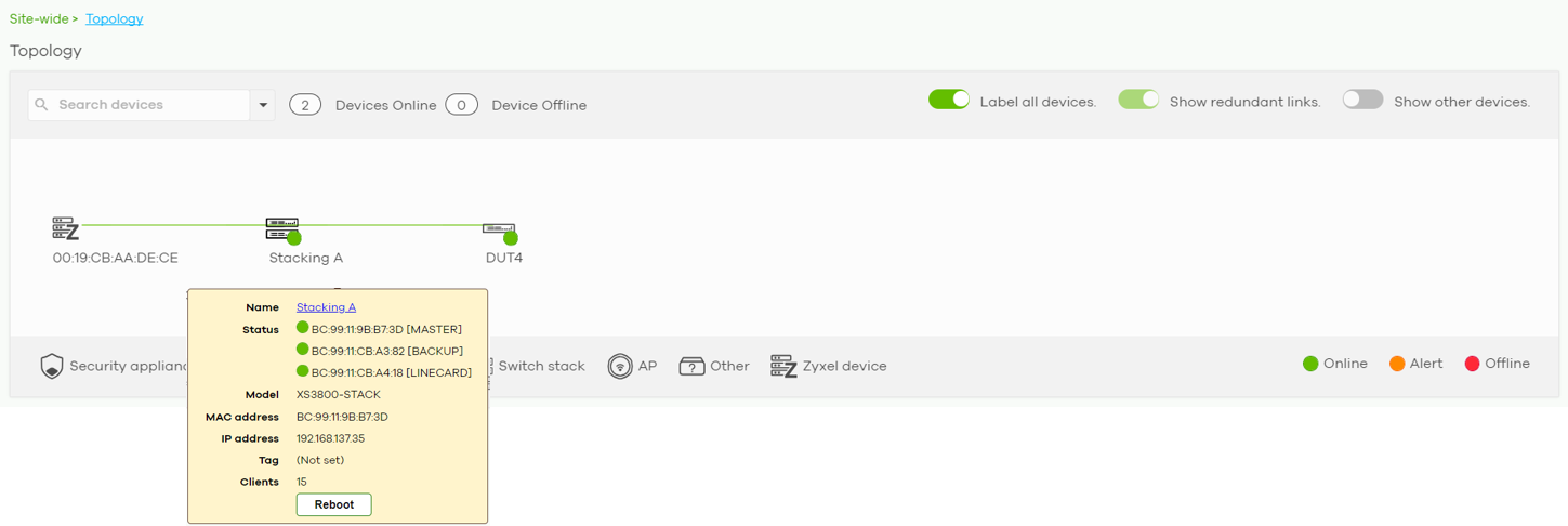 The stack is also shown in the topology graph, making it easy for you to check the network connection status, as well as rebooting if needed.