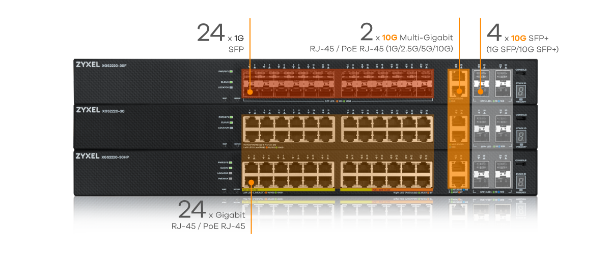 On top of four 10G SFP+ uplinks, the XGS2220 Series comes with two additional 10G Multi-Gig RJ 45 ports to offer the flexibility to connect to servers, network storage, or other high speed network devices. Business can operate smoothly with the better extensibility and robust network infrastructure.