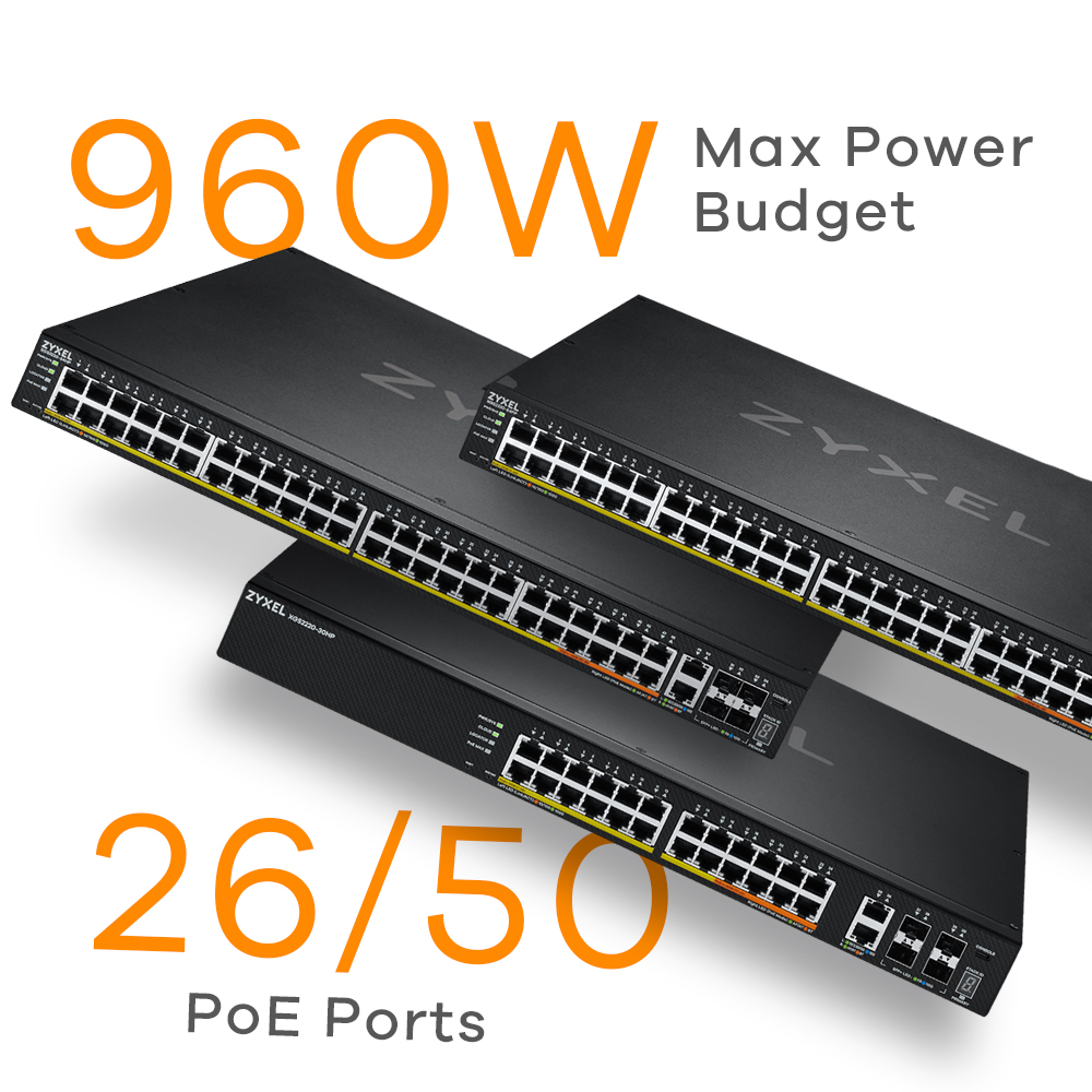 Within the range, the 3 PoE models of 30HP, 54HP and 54FP can offer larger Power budgets of 400 W, 600 W and 960 W respectively, allowing flexibility in powering a full range of PoE devices efficiently for applications like VoIP, surveillance, high density networked AV applications and Zyxel’s compressive WiFi 6/6E AP portfolio.