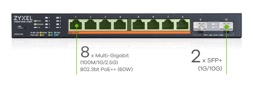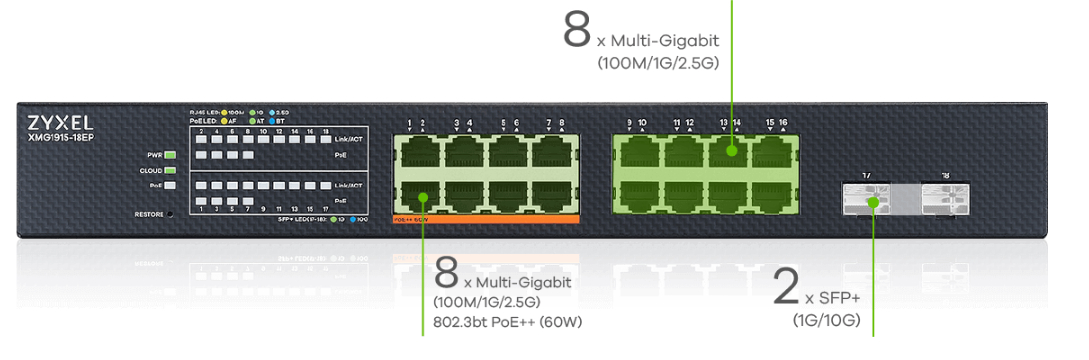Серия XMG1915 разработана с учетом этих меняющихся требований. Доступные в 8- и 16-портовых моделях, они обеспечивают 2,5 Multi-Gigabit Ethernet на всех портах. Также имеются восходящие каналы 10G для подключения к ядру сети и опции PoE++, обеспечивающие до 60 Вт для подключенного устройства. А система централизованного управления сетью Zyxel Nebula делает коммутаторы простыми в развертывании и управлении.