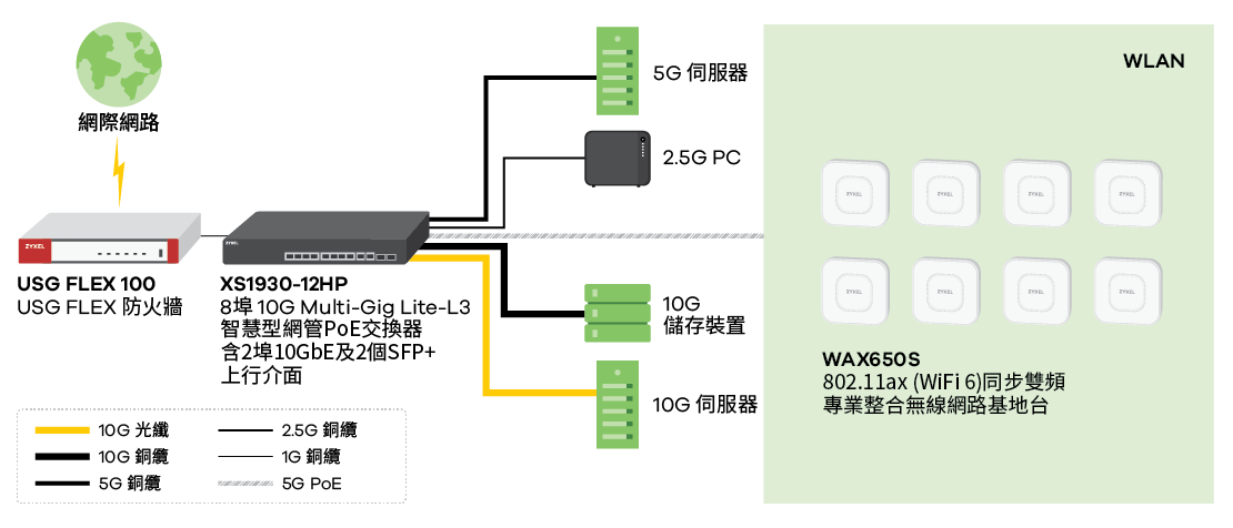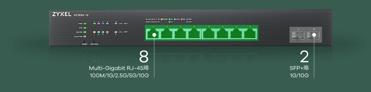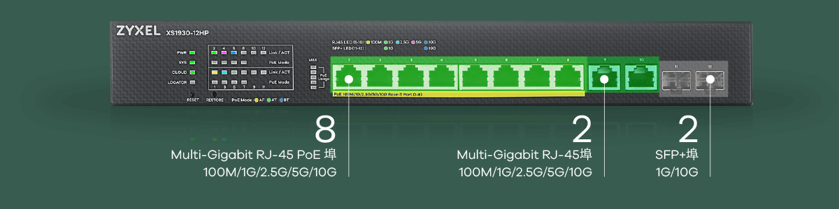 XS1930交換器每一個Multi-Gig埠都支援100M/1G/2.5G/5G/10G五段速度,連接各種不同速度的網路設備都超適合,特別是對於伺服器、電腦、最新的WiFi 6 (11ax)無線網路基地台等需要2.5G/5G連線速度的設備。過去因為有線網路只有支援1G或10G,而被迫調降速度,現在有了五段速度的支援,這些設備都能在最大效能之下運行。