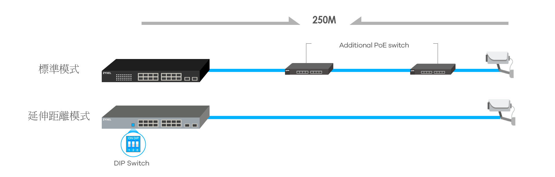 一般PoE 交換器有最遠100公尺的傳送距離限制。考量到IP-CAM或是其他安控設備常有安裝在較遠位置的需求,只要撥動面版上的DIP開關來開啟延伸距離模式,即可用現有的Cat5e線達到最遠250公尺的長距離布建。不需要額外設備串聯,一台交換器就能夠完成PoE建置,省錢又省力!