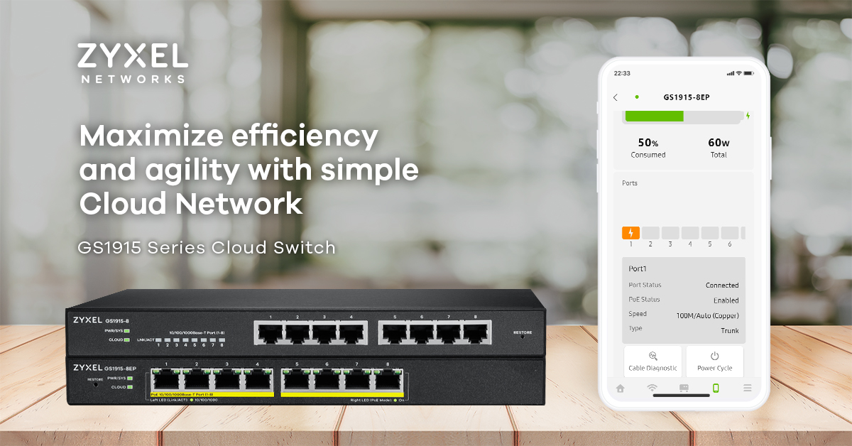 Đài Loan, 28 tháng 3 năm 2023 — Zyxel Networks, một trong những công ty hàng đầu chuyên cung cấp các giải pháp mạng an toàn được hỗ trợ bởi điện toán đám mây, vừa cho ra mắt dòng sản phẩm Switch 8 cổng GS1915 với công nghệ PoE được tích hợp phụ thuộc vào nhu cầu của khách hàng. GS1915 có thiết kế nhỏ gọn, cung cấp kết nối mạng linh hoạt, dễ dàng chuyển đổi sang Cloud và quản lý nhiều thiết bị hiệu quả hơn cho các doanh nghiệp nhỏ với chi phí hợp lý.